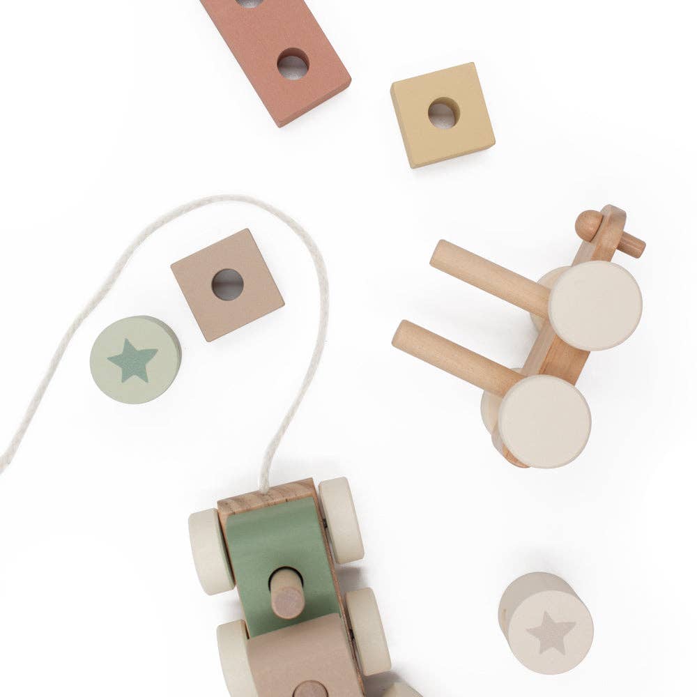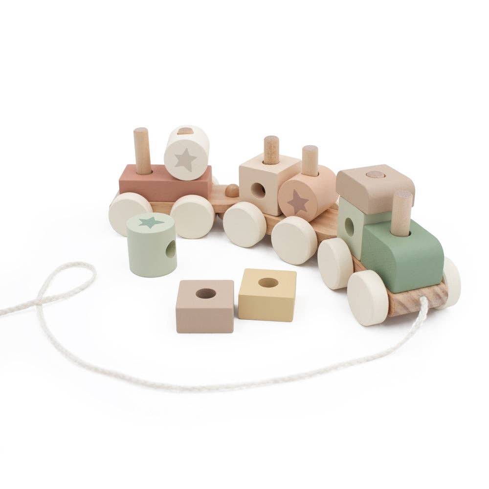 Part of the Jumini Giftable collection - The Joy of Play, Wrapped and Ready. A delightful wooden stacking train featuring pastel blocks and engaging shapes. Encourages hand-eye coordination and problem solving through play. Beautifully designed in our soft pastel colour palette and clean, modern styling. Presented in a rope-handled gift box.
